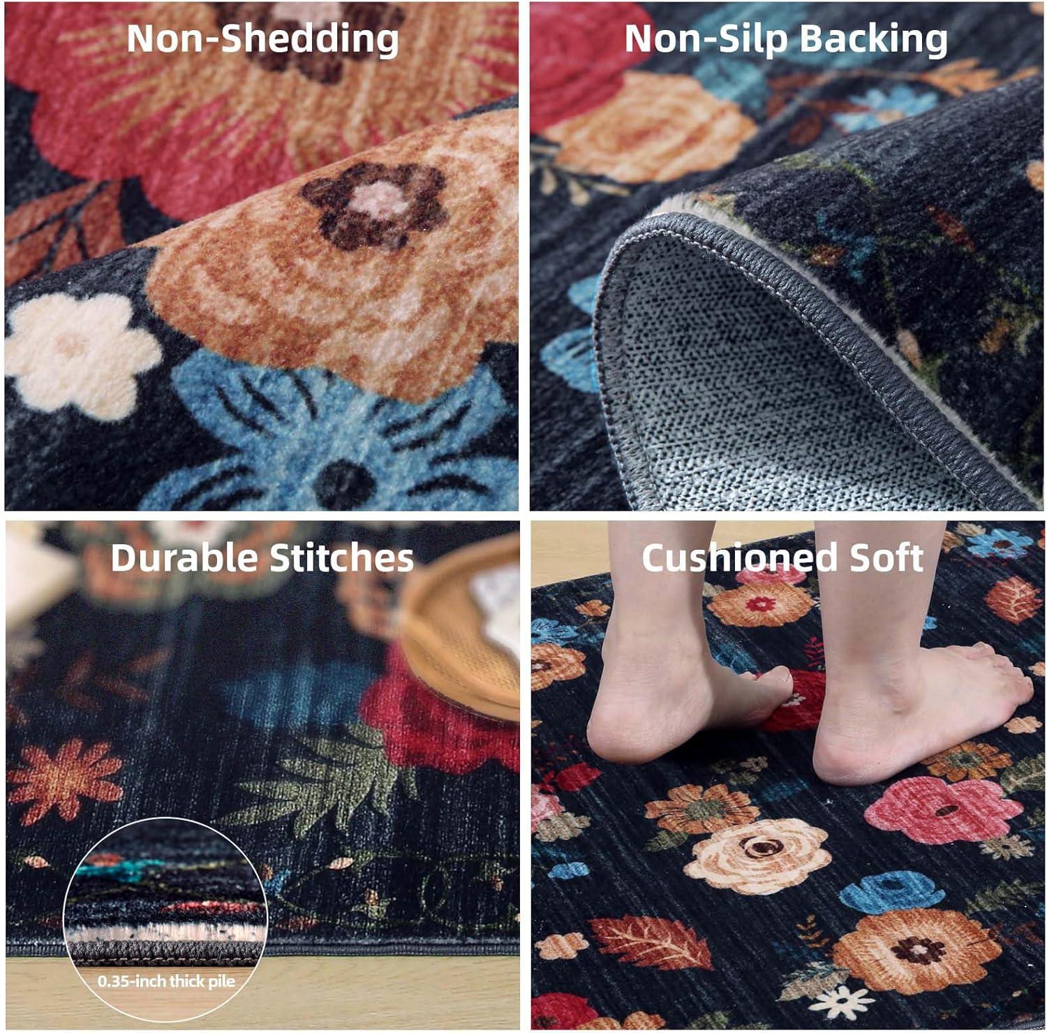 Machine Washable Runner Rug for Hallway: 2’6″x8′ Kitchen Runners Rug with Rubber Backing Non Slip Stain Resistant Floral Floor Rug Soft Carpet Runners for Indoor Entryway Bedroom Bedside Living Room(Black Floral)