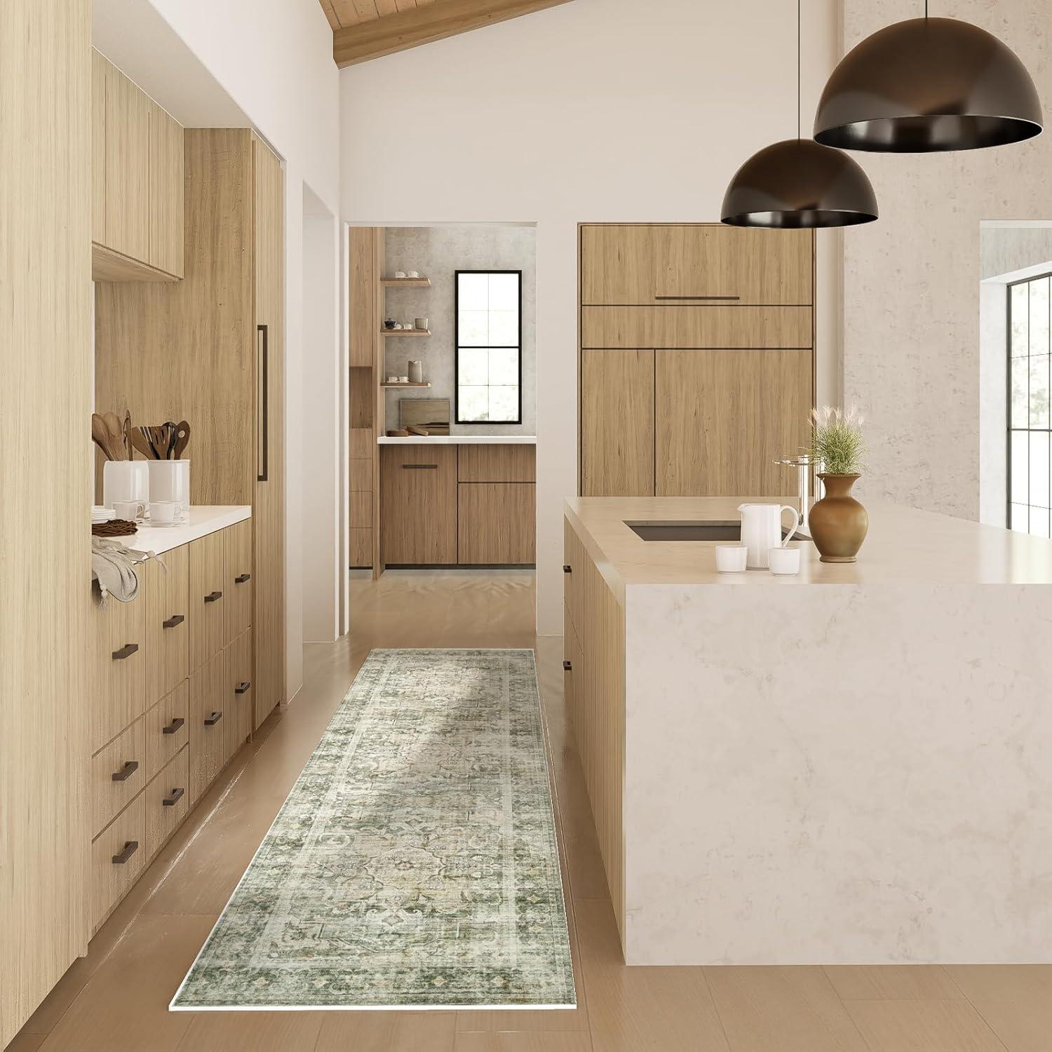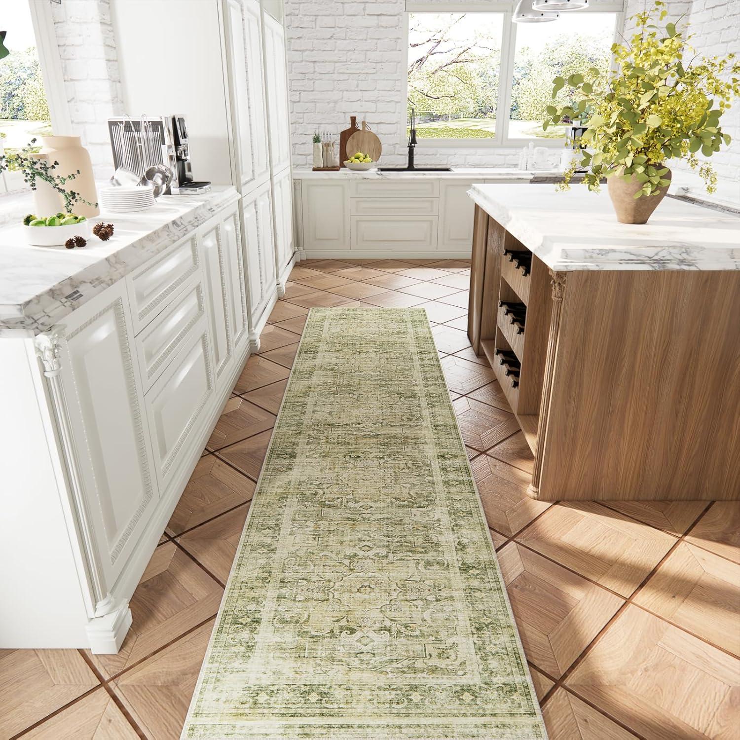 Machine Washable Runner Rug for Hallway: 2’6″x8′ Kitchen Runners Rug with Rubber Backing Non Slip Stain Resistant Floral Floor Rug Soft Carpet Runners for Indoor Entryway Bedroom Bedside Living Room(Green)