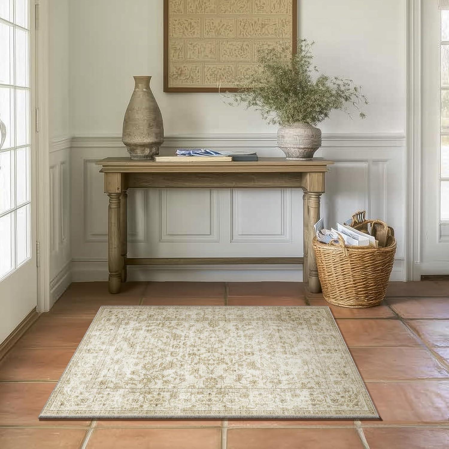 Machine Washable Throw Rugs for Entryway: Door Mat Indoor Entrance 4x6 Rug Small Area Rug Non Slip Low Pile Soft Kitchen Rugs for Front Door Indoor Entrance Entry Kids Room(Beige and Brown)