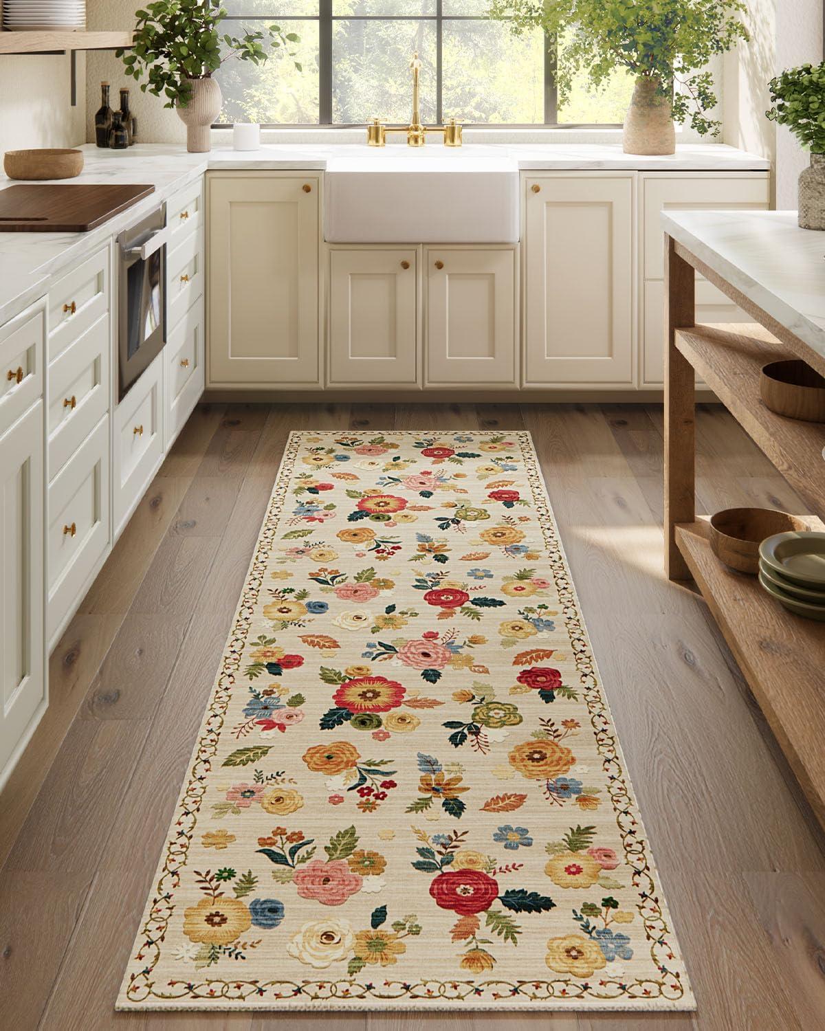 Washable Kitchen Rugs Non Slip: 2'x6' Hallway Runner Rug Stain Resistant Low Pile Floral Floor Rug with Rubber Backing Non Shedding Soft Carpet Runners for Indoor Entryway Bedside Bedroom Farmhouse(Beige Floral)