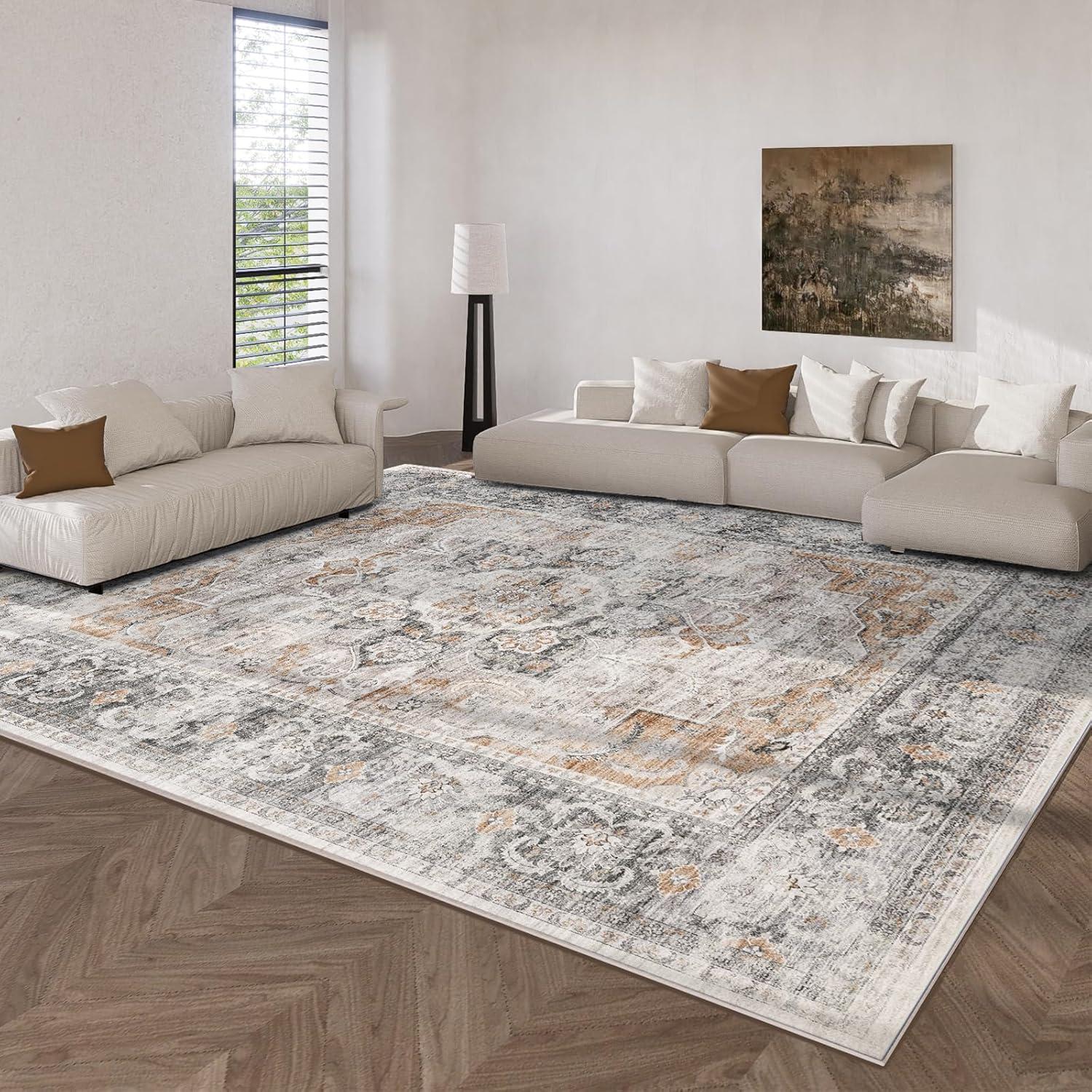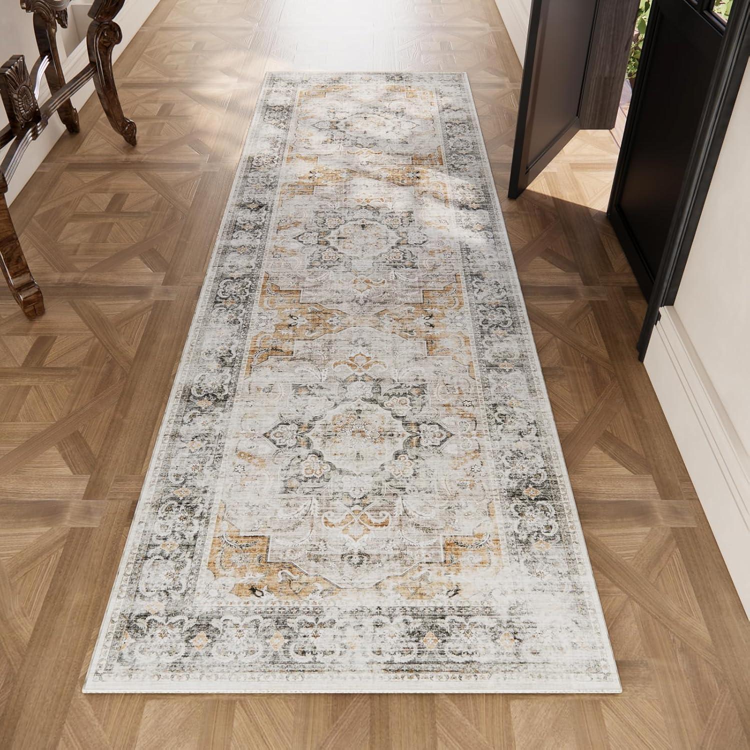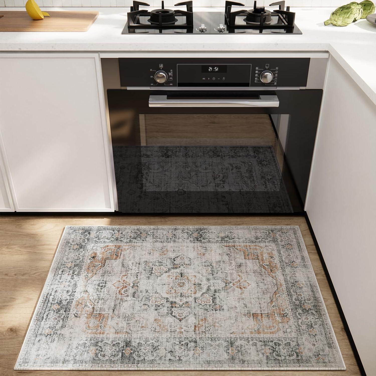 Washable Kitchen Rugs Non Slip: 2’x6′ Hallway Runner Rug Stain Resistant Low Pile Floral Floor Rug with Rubber Backing Non Shedding Soft Carpet Runners for Indoor Entryway Bedside Bedroom Farmhouse(Grey and Orange)