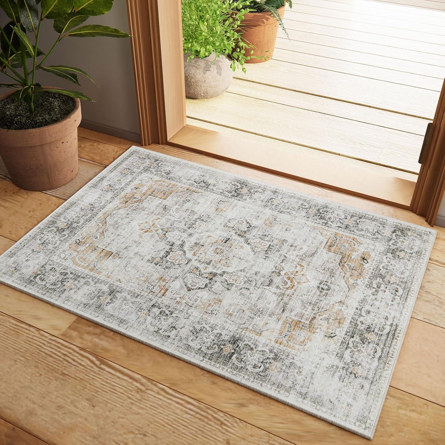 Washable Kitchen Rugs Non Slip: 2'x6' Hallway Runner Rug Stain Resistant Low Pile Floral Floor Rug with Rubber Backing Non Shedding Soft Carpet Runners for Indoor Entryway Bedside Bedroom Farmhouse(Grey and Orange)