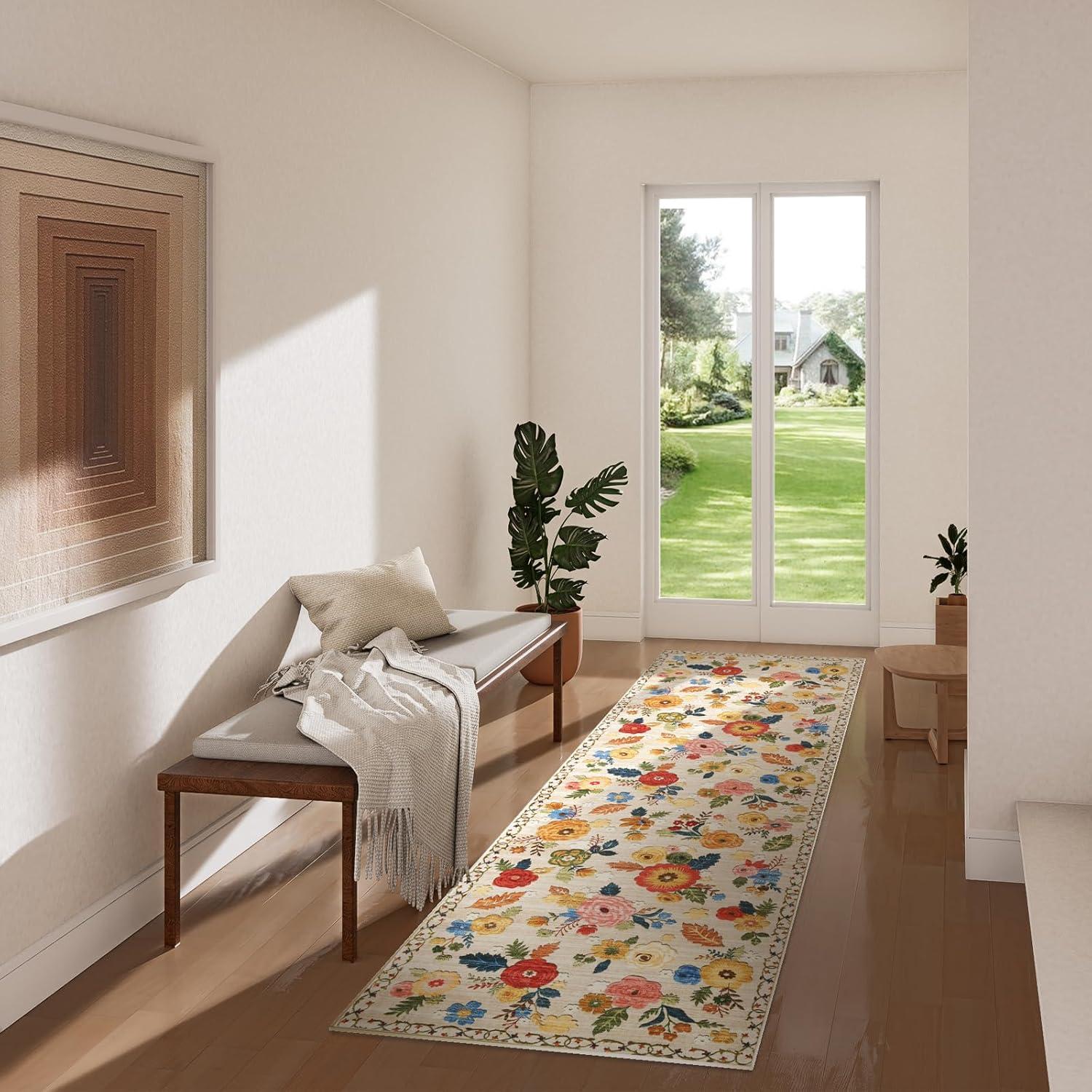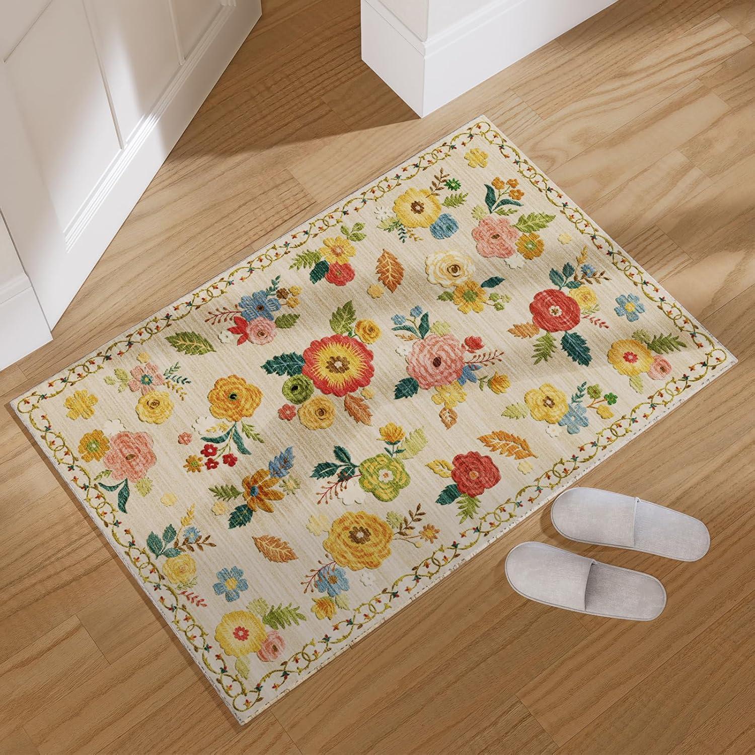 Washable Small Entryway Area Rugs: 2'x3' Floral Rug Non Slip Door Mat Indoor Entrance Stain Resistance Low Pile Throw Rugs for Inside Front Door Floor Bedroom Bedside Kitchen Nursery Dorm Home Entry(Beige Floral)